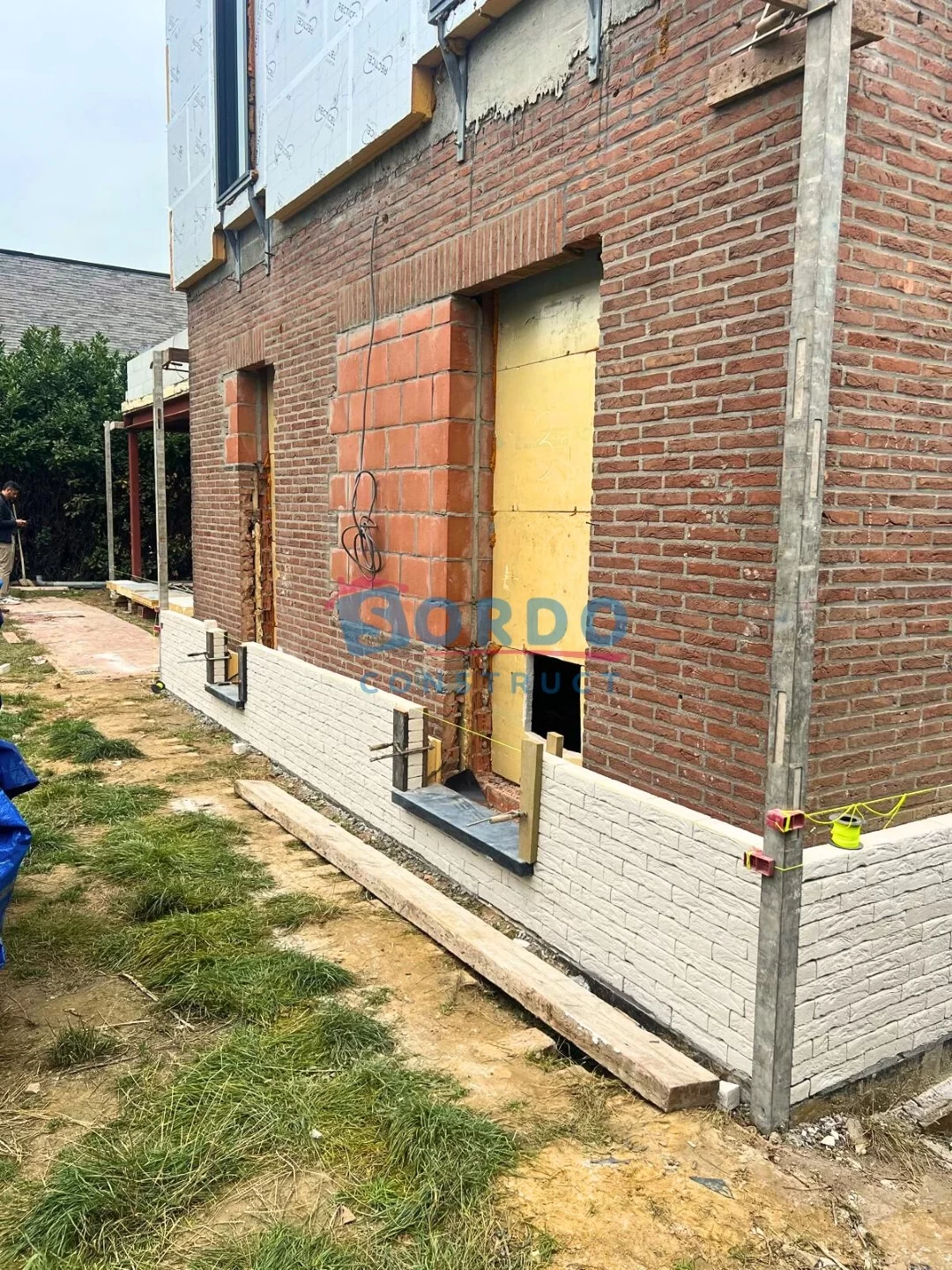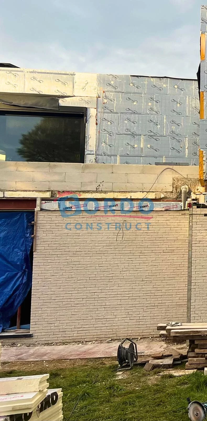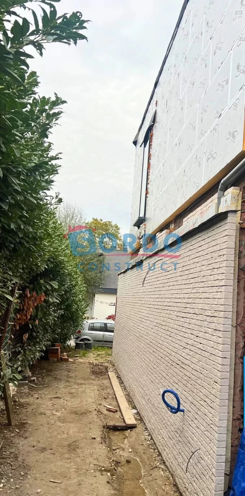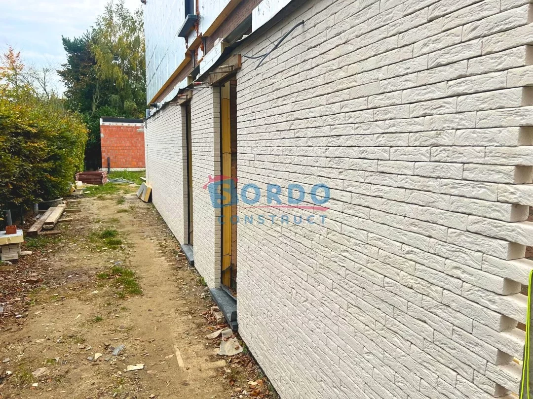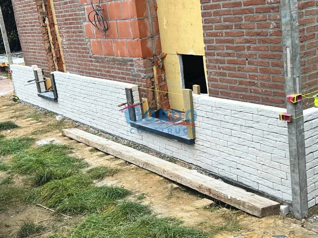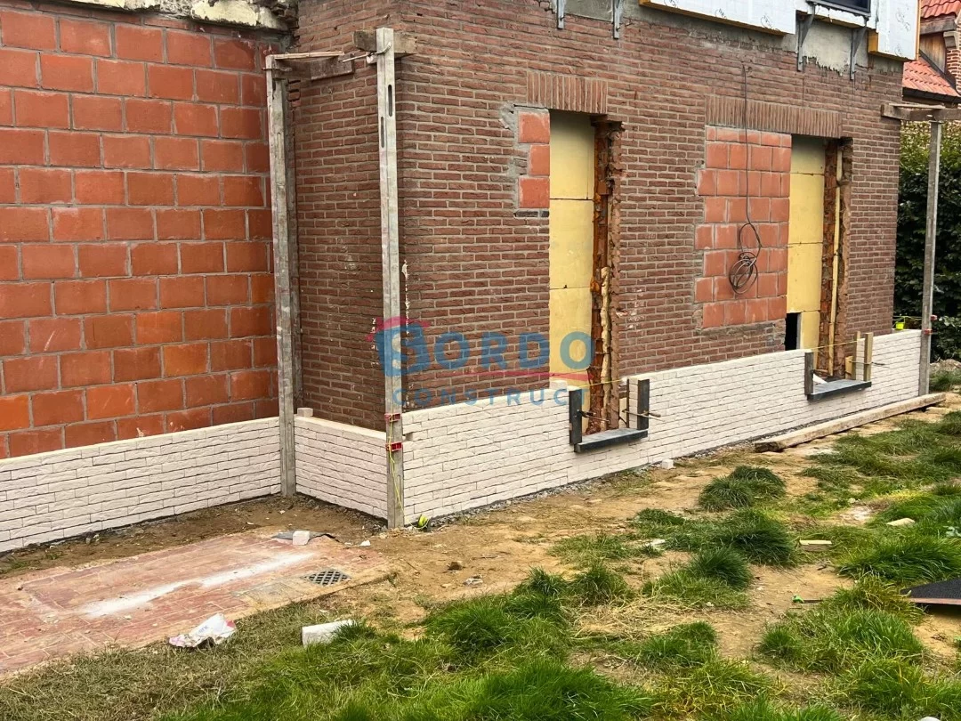 Na de voorbereidende werken hebben wij de ruwbouw van de uitbreiding uitgevoerd en het bestaande volume structureel aangepast om de nieuwe verdieping veilig en stabiel te dragen. Vervolgens hebben wij de gevel volledig vernieuwd en voorzien van hoogwaardige gevelisolatie, afgewerkt met gelijmde gevelstenen. Deze moderne techniek zorgt niet alleen voor een strakke uitstraling, maar ook voor betere energieprestaties en duurzaamheid.